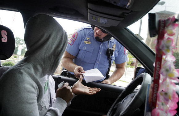 Raleigh police officer G.H. Sorrell hands Denay Andrews a traffic-safety brochure after he