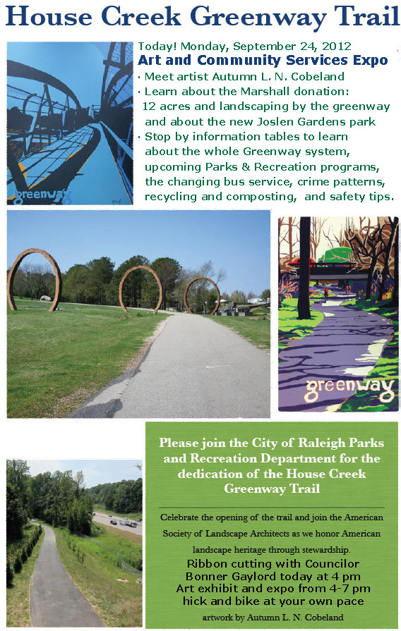 House Creek Greenway ribbon cutting at 4pm, arts & community services expo 4-7
